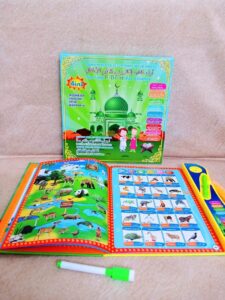 ومزود أيضا بصفحات كرتون مقوى مليئة بالأسئلة المختلفة حيث يقوم الطفل بحلها بواسطة قلم الكتاب القابل للمسح ، بحيث تنمي مهارات الطفل في الكتابة.