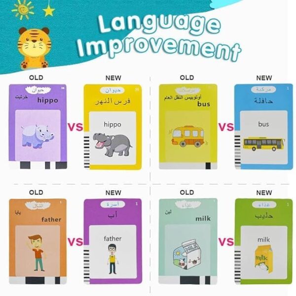 بطاقات فلاش الناطقة تساعد الأطفال علي تعلم الحروف الأبجدية والكلمات العربية والإنجليزية ومعرفة أسماء الطعام ، وسائل المواصلات ، الألوان ، الحيوانات ،الأصوات والفواكه.