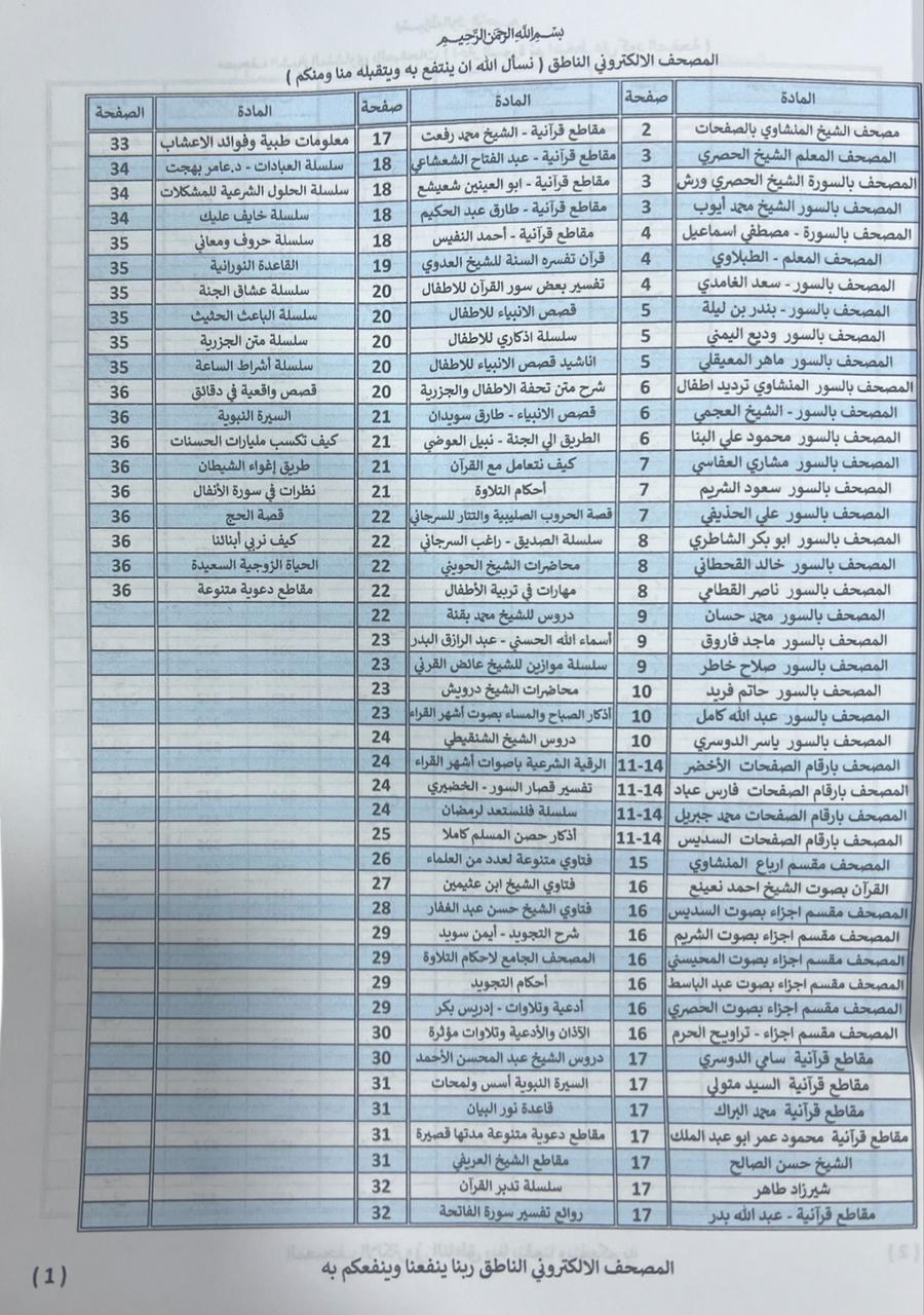 الشيخ المنشاوي والشيخ الحصري مرتل وبترديد الاطفال والشيخ محمود علي البنا والشيخ مصطفى اسماعيل والشيخ محمد حسان والشيخ ماهر المعيقلي وفارس عباد وبندر بن ليلة والغامدي ومحمد ايوب والسديس والشريم والحذيفي ومشاري العفاسي والدوسري وناصر القطامي وابو بكر الشاطري وغيرهم وقراءات نادرة للشيخ محمد رفعت وابو العينين شعيشع